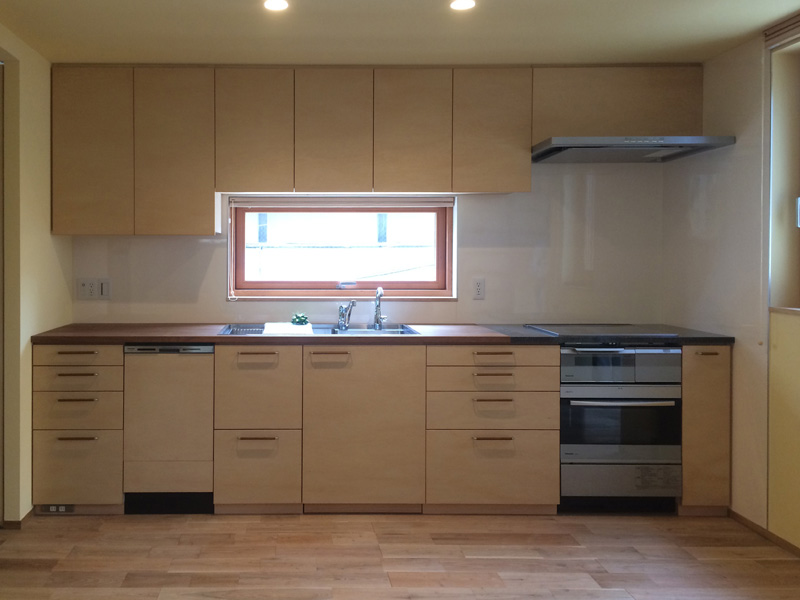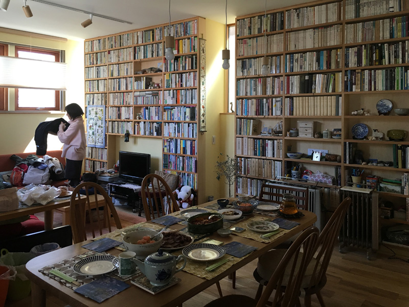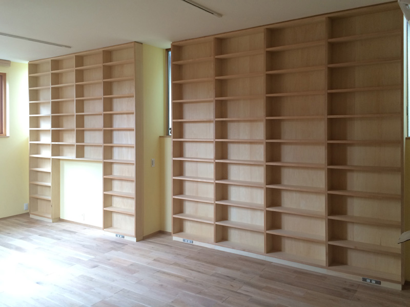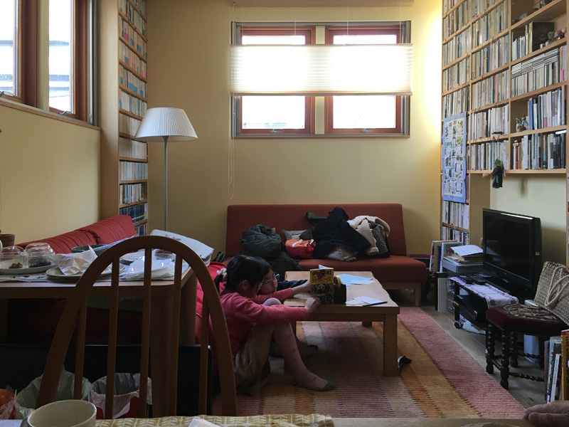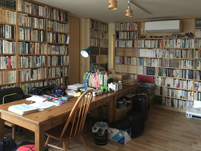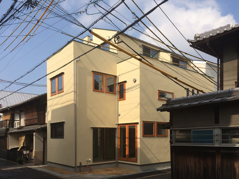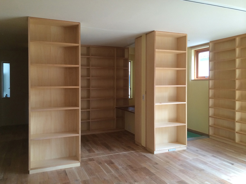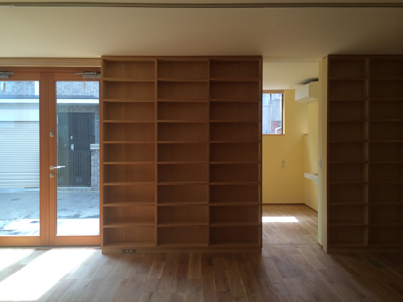 阿倍野元町の家 t 木造3階建(SE構法) 戸建住宅 新築 2016年 大阪都市部の高密度な地域に、敷地いっぱいに建てた木造3階建ての住宅です。多くの本が収納できるように1階に図書室および書斎を設け、その他の壁面にも造り付けの本棚を多く設けました。法規上の斜線制限によるセットバックを屋上テラスとして内と外のつながりを意識した設計としました。
