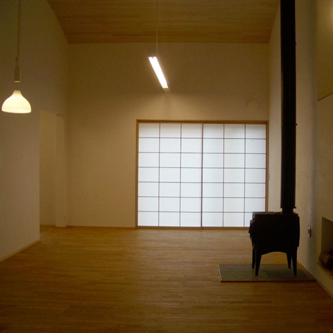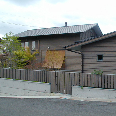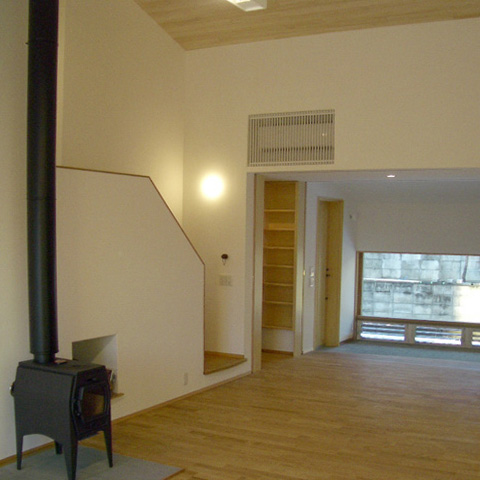 Enkel house t+a 鉄筋コンクリート造・木造地上1階地下1階建 戸建住宅 新築 2006年 中村好文氏に協力 外観は街並みのなかに溶け込むように配慮しました。内部は薪ストーブのある天井の高いゆったりとしたLDを中心に、多くの本を収納する書庫廊下が住まいの各スペースをつなぎあわせます。