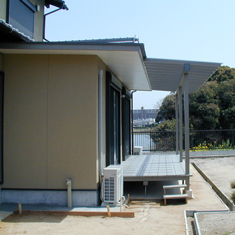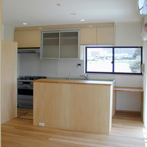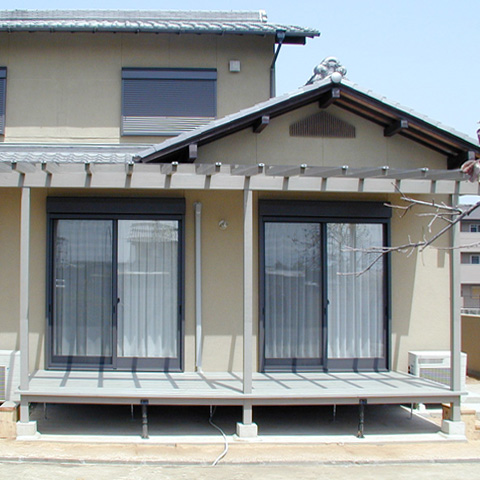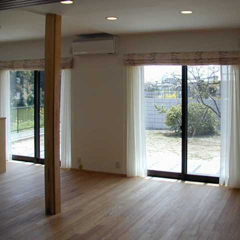 軽里の家 t 木造2階建 戸建住宅 改修 2006年 古墳の濠のそばに建つ一戸建て住宅の増築と改修。LDとテラス、庭を一体とし、庭越しに古墳の緑と濠の水面を見渡せるように計画しました。内部は極力シンプルにし、柱や家具、建具の木部を生かすことで、空間に柔らかさを与えています。