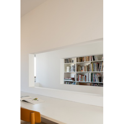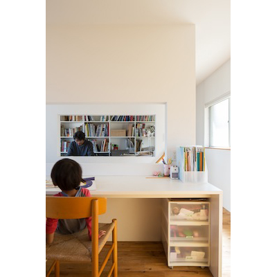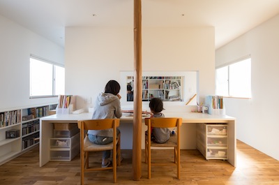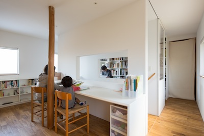 2階には子供達が寝るための最小限の部屋と、共同のワークスペースとして、子供たちの机と、両親の作業机を階段を挟んで向かい合わせて設置し、家族の顔が見える配置としました。