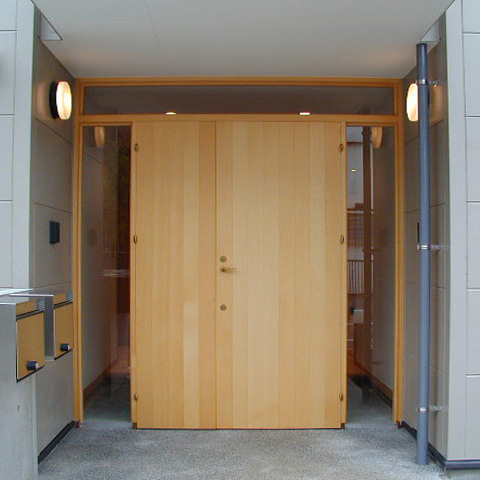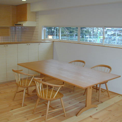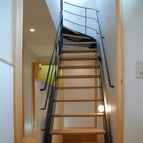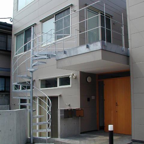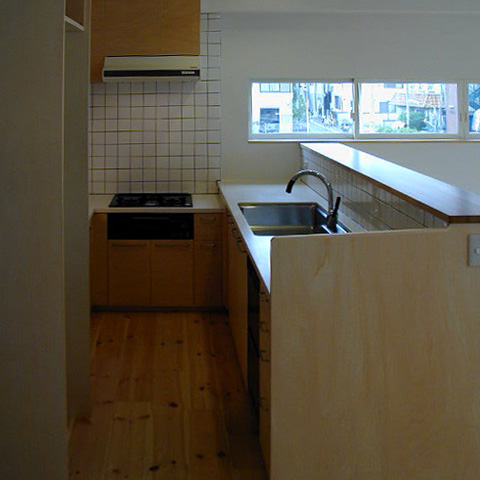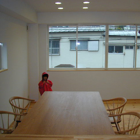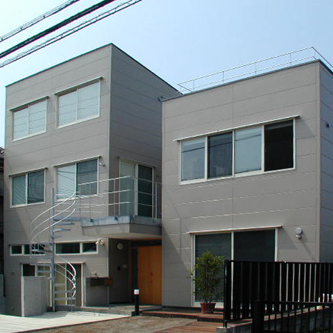 世田谷の家 t 鉄骨造3階建 戸建住宅(二世帯住宅) 新築 2004年 中村好文氏に協力 二世帯を上下に重ねるのではなく、東西2つの棟に分け、間に玄関、ホール、階段を儲け、緩衝空間とすることにより、ニ世帯間に適度な距離をとりました。平面的に分けたことにより、両世帯のパブリックスペースを同じ階に置くことが可能になり、廊下、屋上テラスを介して二世帯間を行き来できる回遊性のある空間とすることができました。