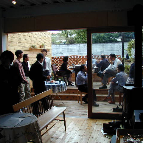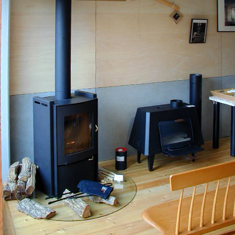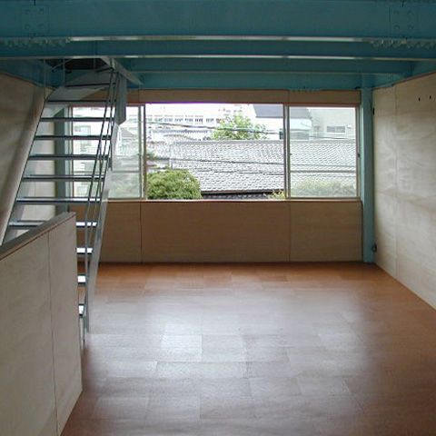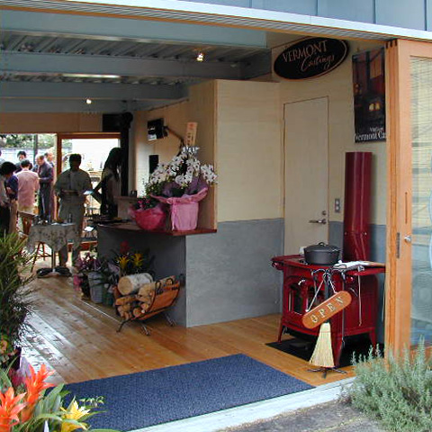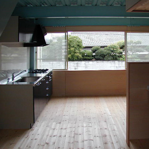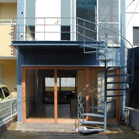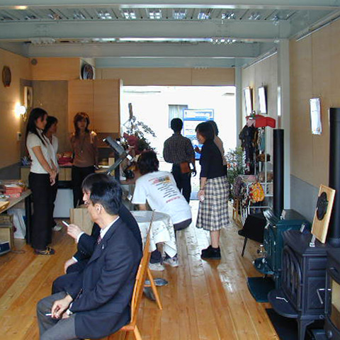 Vinterflamme帝塚山(帝塚山の家) t 鉄骨造3階建 戸建店舗併用住宅 新築 2003年 1階は作品を展示するギャラリーであり、薪ストーブ、家具、木の器などを展示販売する店舗でもあります。品物を並べて売るだけの店舗ではなく、おいしい紅茶が飲めるカフェ的な空間としておき、品物は厳選したものを少量だけ置いて、お茶を飲みながらゆっくりとその品物を見て、体感して購入してもらうという形式のお店を計画しています。2・3 階を住宅として使っています。