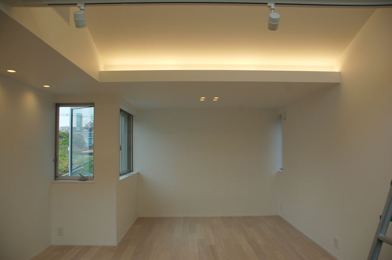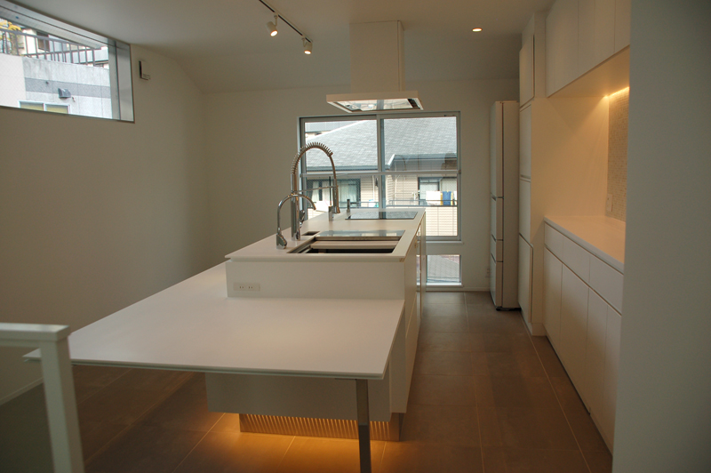 お料理教室をされたいというお施主さんの意向を踏まえ、もっとも広がりのある最上階にキッチンとリビングを設置し、建物が並んで立っている地域であるため、空が見えるように開口を設けました。